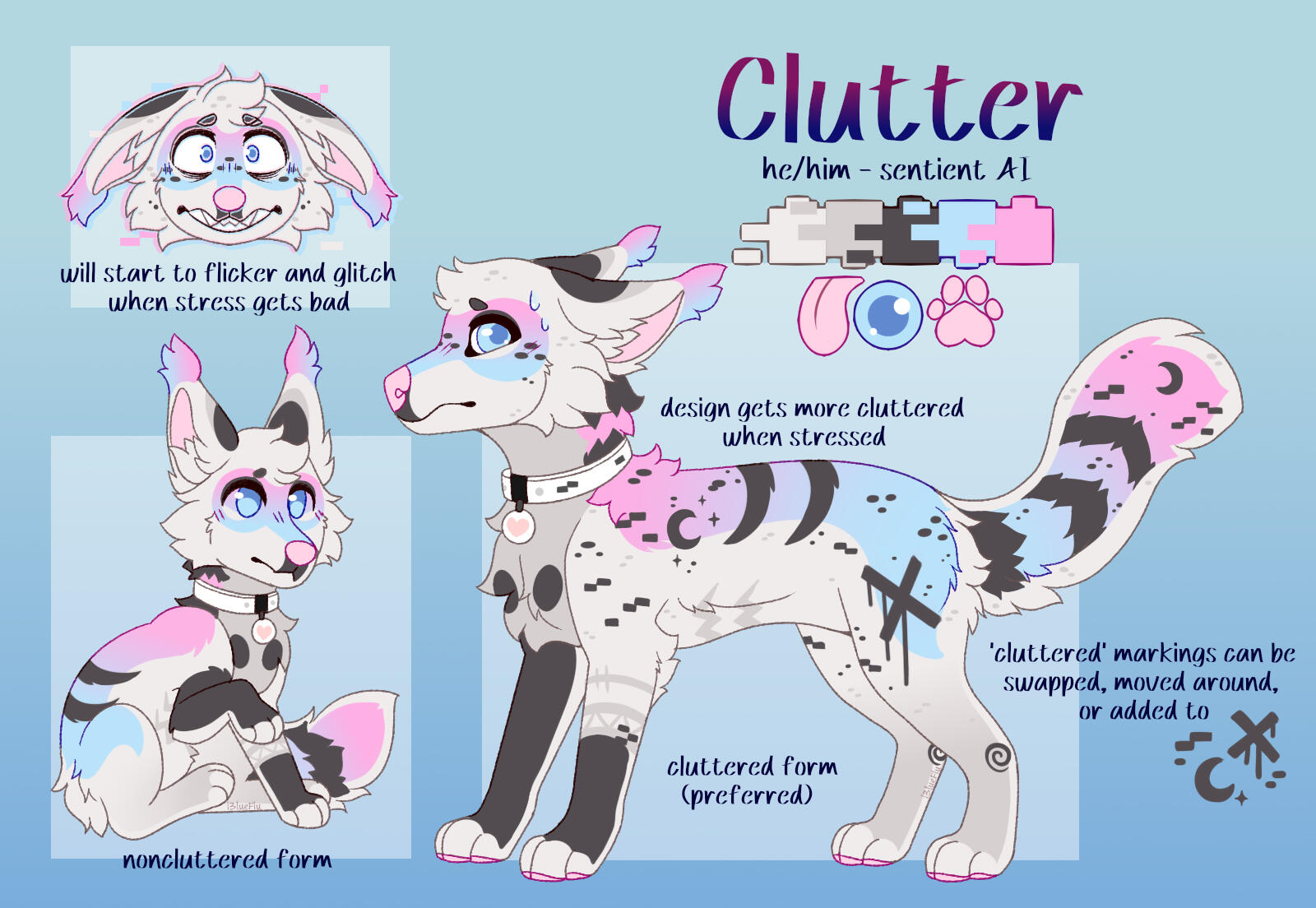 ♡ You may make any changes to the character as you wish; change species/gender/markings/colors/give them alt forms, etc!♡ I'm fine with my designs being completely redesigned, whether by yourself or commissioned, as long as I'm credited for the original design and the original is not deleted.♡ My designs may not be used to promote or condone illicit behavior outside of story telling purposes. My designs absolutely may NOT be used in works to glorify pedophilia/bestiality/sexual assault/racism/homophobia/etc..♡ As the character owner, you have the right to modify, re-upload, share, or otherwise use original design's art, so long as I am credited for the original work (in the case a base was used, the maker shall be credited too)♡ Commercial use of my designs are permitted. Though you must not sell merchandise using the artwork I made of them.♡ If you commissioned me for a redesign, please only credit me for the edits, and keep the original creator credited for the original design.♡ No need to credit/tag me every single time you draw a design by me, just please don't claim you originally designed them yourself. If uploaded to toyhou.se, please credit me under @l3lue